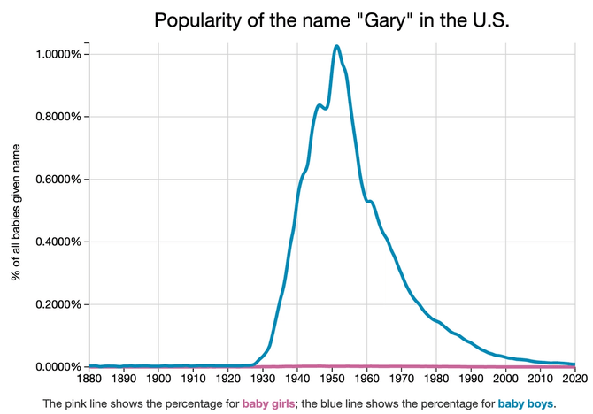 Historically, Gary had its moment. It surged in the U.S. in the mid-20th century, peaking in the 1950s when every other baby seemed to be a Gary, probably inspired by heartthrob Gary Cooper. But today? Gary’s on life support. You don’t meet baby Gary’s anymore. I saw a TikTok where a woman cackled at the idea of naming a kid Gary: “Imagine saying, ‘Gary, don’t put that in your mouth!’ or ‘Gary, time for your bath!’” It’s an old man name, the kind that conjures an “Uncle Gary” with a fishing hat and a tall tale. When I introduce myself, people pause, their faces screaming, “A wild Gary? In 2025?” It’s like I’m a unicorn, or maybe a dodo.